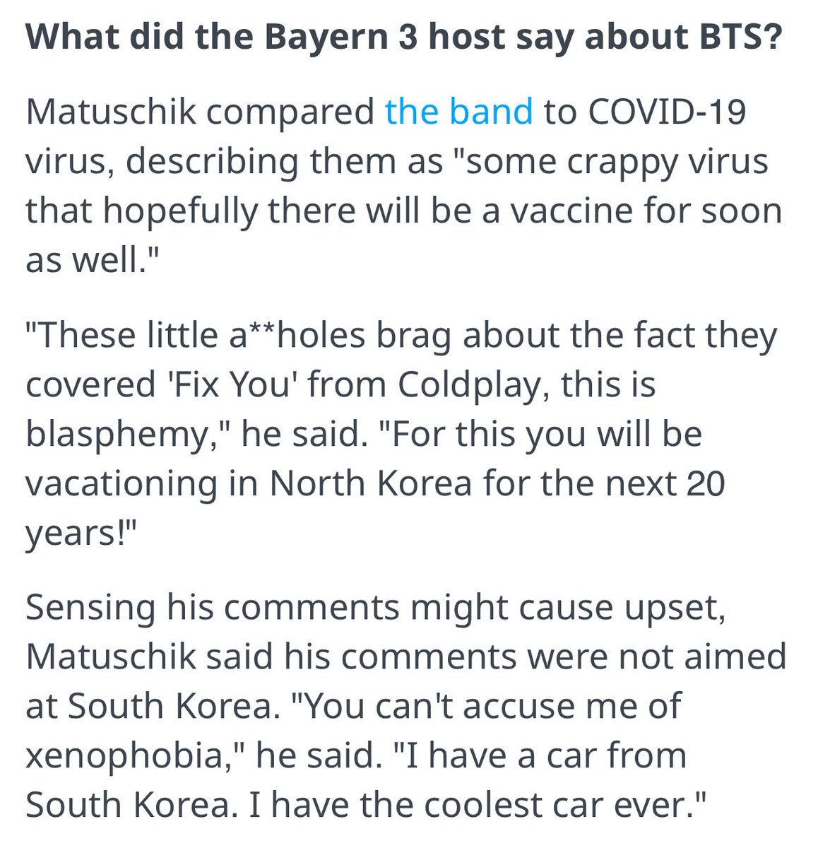 Matthias matuschik went on air calling bts a virus like covid and said he hoped a vaccine for them would be available soon. 343k likes · 7,555 talking about this. Bayern 3 radyo istasyonundan alman radyo sunucusu matthias matuschik, bts hakkındaki ırkçı yorumları nedeniyle ateş altında. German radio network bayern 3's presenter mattias matuschik has invoked the bts army's wrath worldwide. @bayern3 racism is not an opinion virus jokes against asians and mentioning north korea is a personal opinion and not racism?😔 #bayern3racist #rassimusbeibayern3.